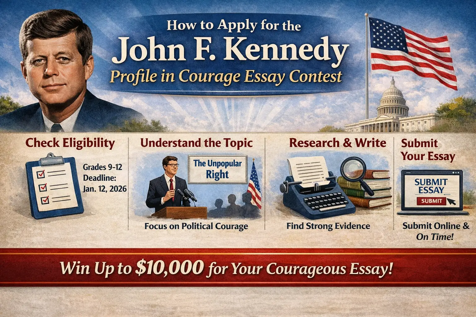 The John F. Kennedy Profile in Courage Essay Contest is a nationally recognized scholarship opportunity for high school students who want to demonstrate strong research, writing skills, and an understanding of constitutional values. With awards of up to $10,000, this contest rewards essays that highlight political courage, especially when leaders take principled stands despite serious personal or political risk.